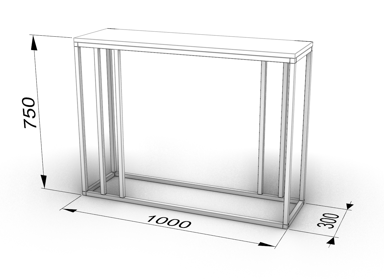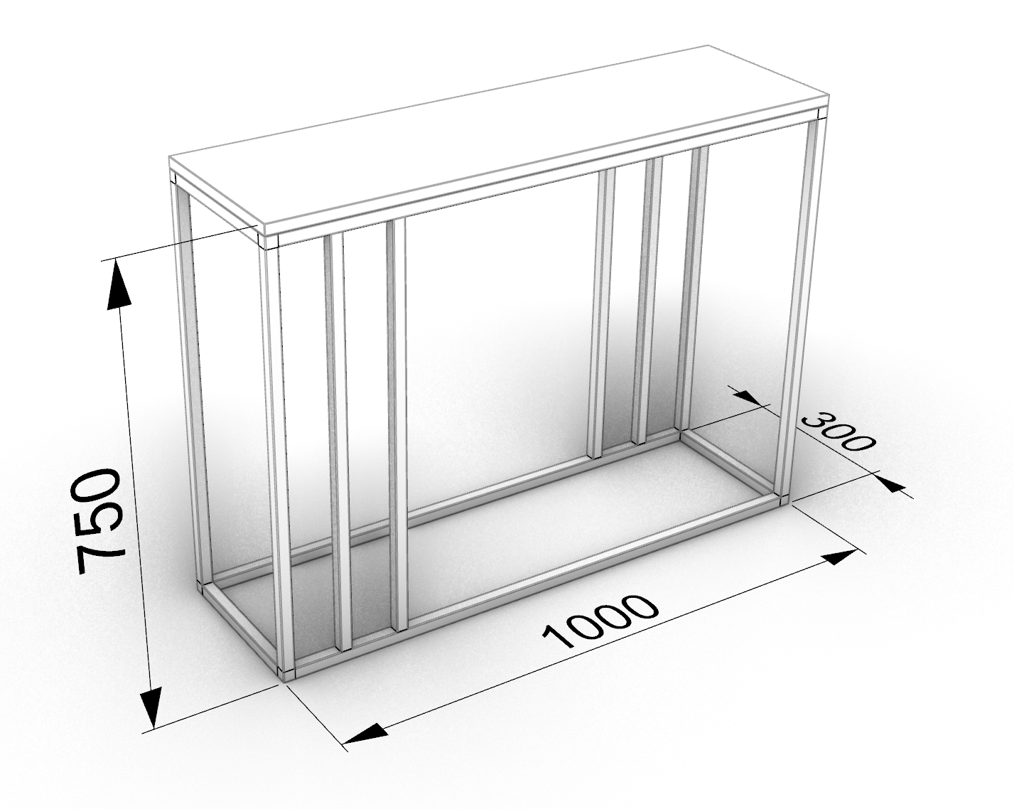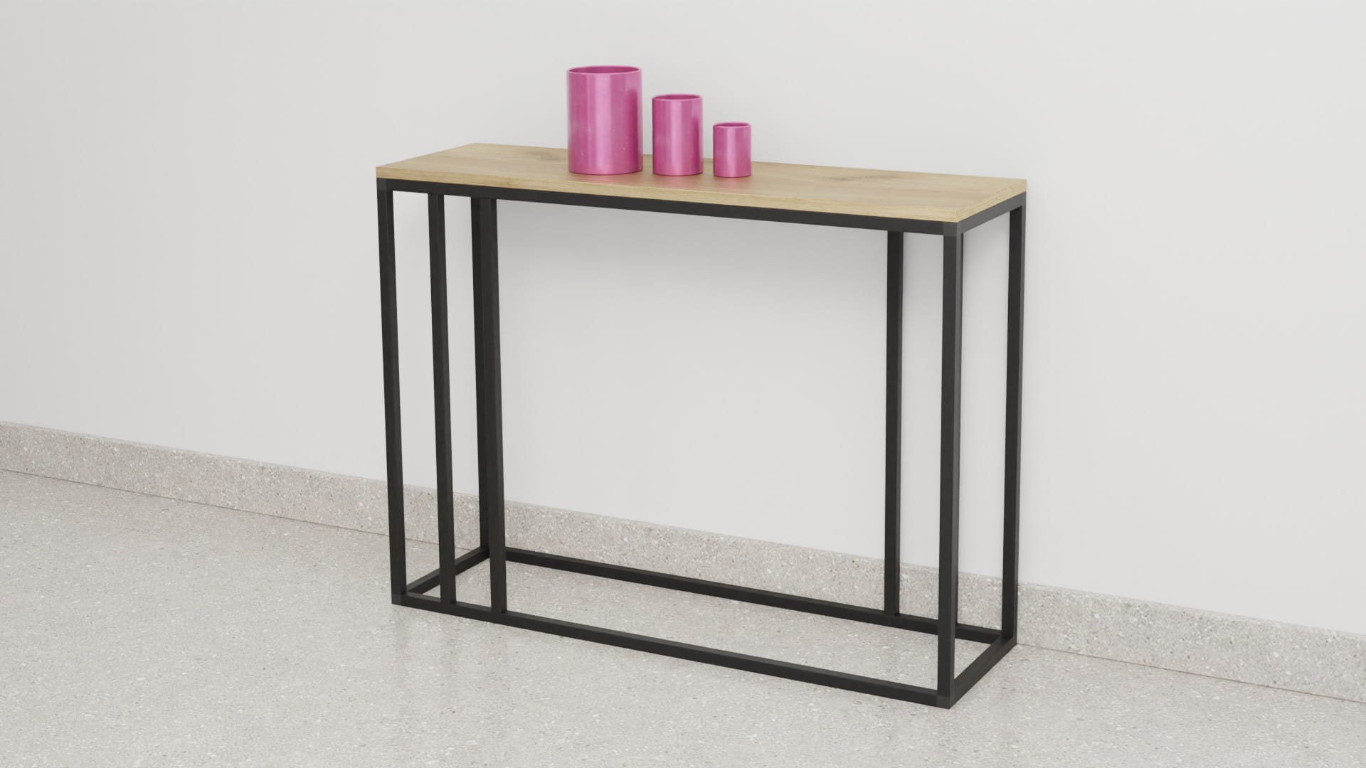 Konsola wykonana z profili aluminiowych, anodowanych na kolor czarny. Profile łączone za pomocą specjalnych złączek z tworzywa wzmacnianego włóknem szklanym. Półki wykonane z płyty meblowej. Kolor płyty do wyboru z rozwijanej listy. Prosimy o dokonanie wyboru koloru w trakcie zakupu.