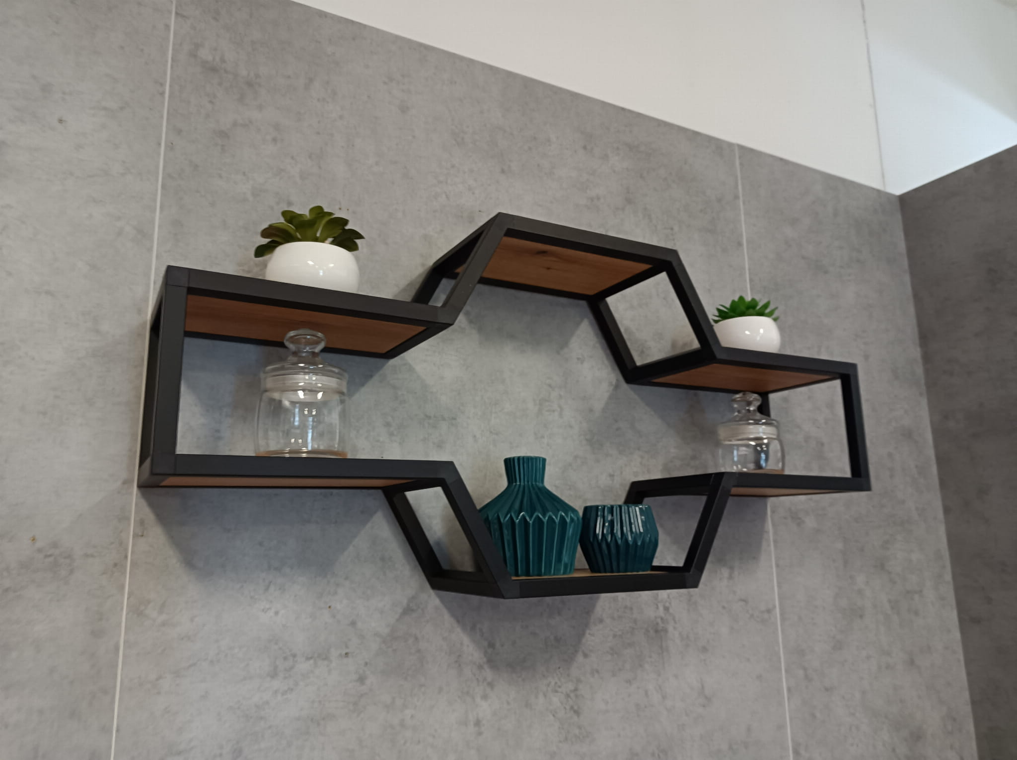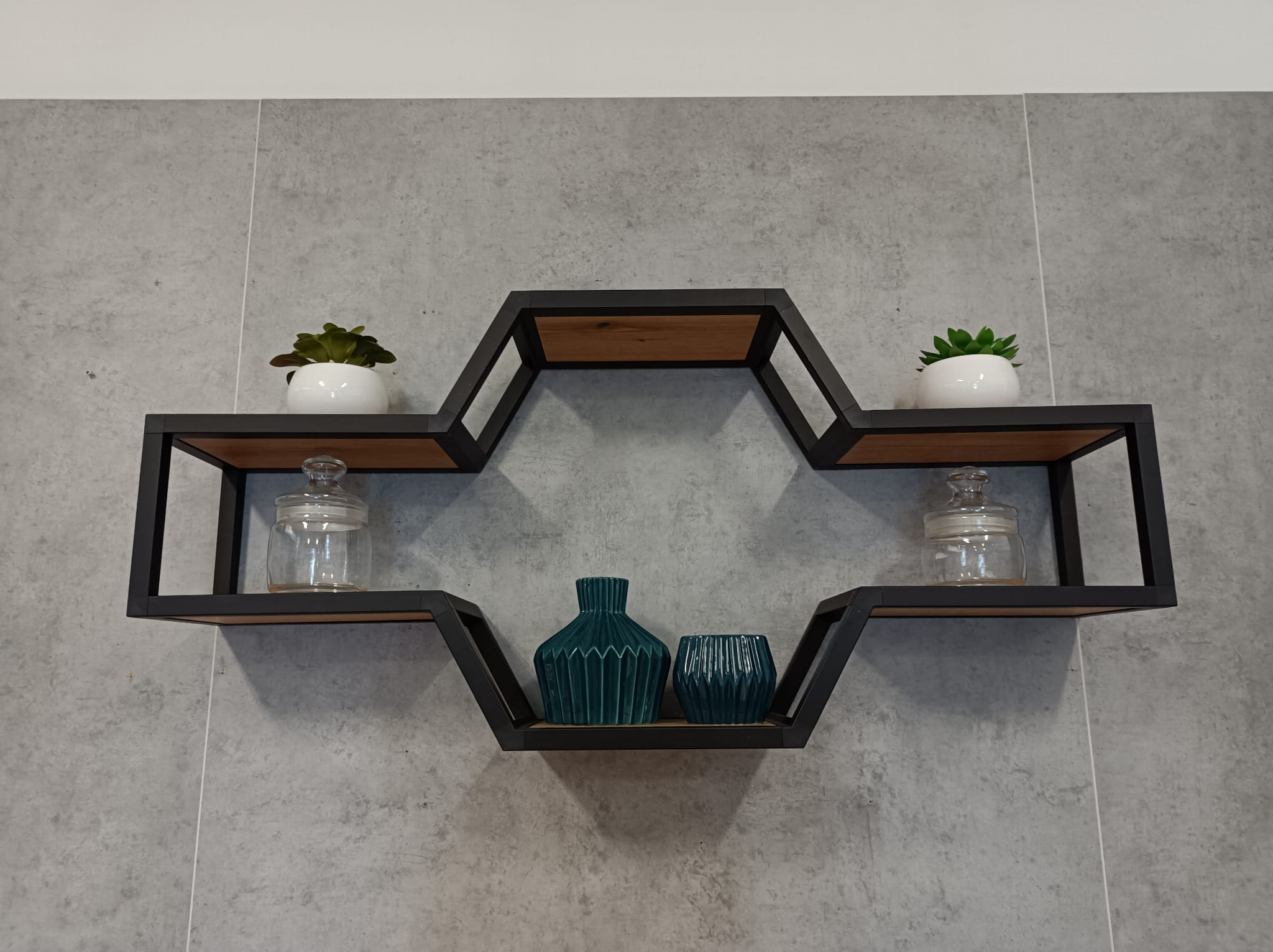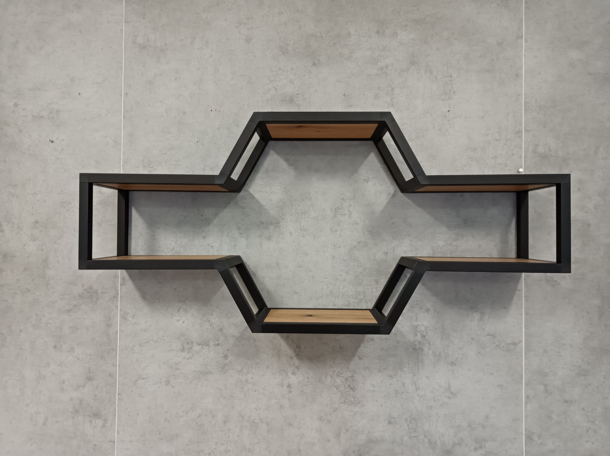 Półka wykonana z profili aluminiowych, anodowanych na kolor czarny. Profile łączone za pomocą specjalnych złączek z tworzywa wzmacnianego włóknem szklanym. Półki wykonane z płyty meblowej. Kolor płyty do wyboru z rozwijanej listy. Prosimy o dokonanie wyboru koloru w trakcie zakupu.