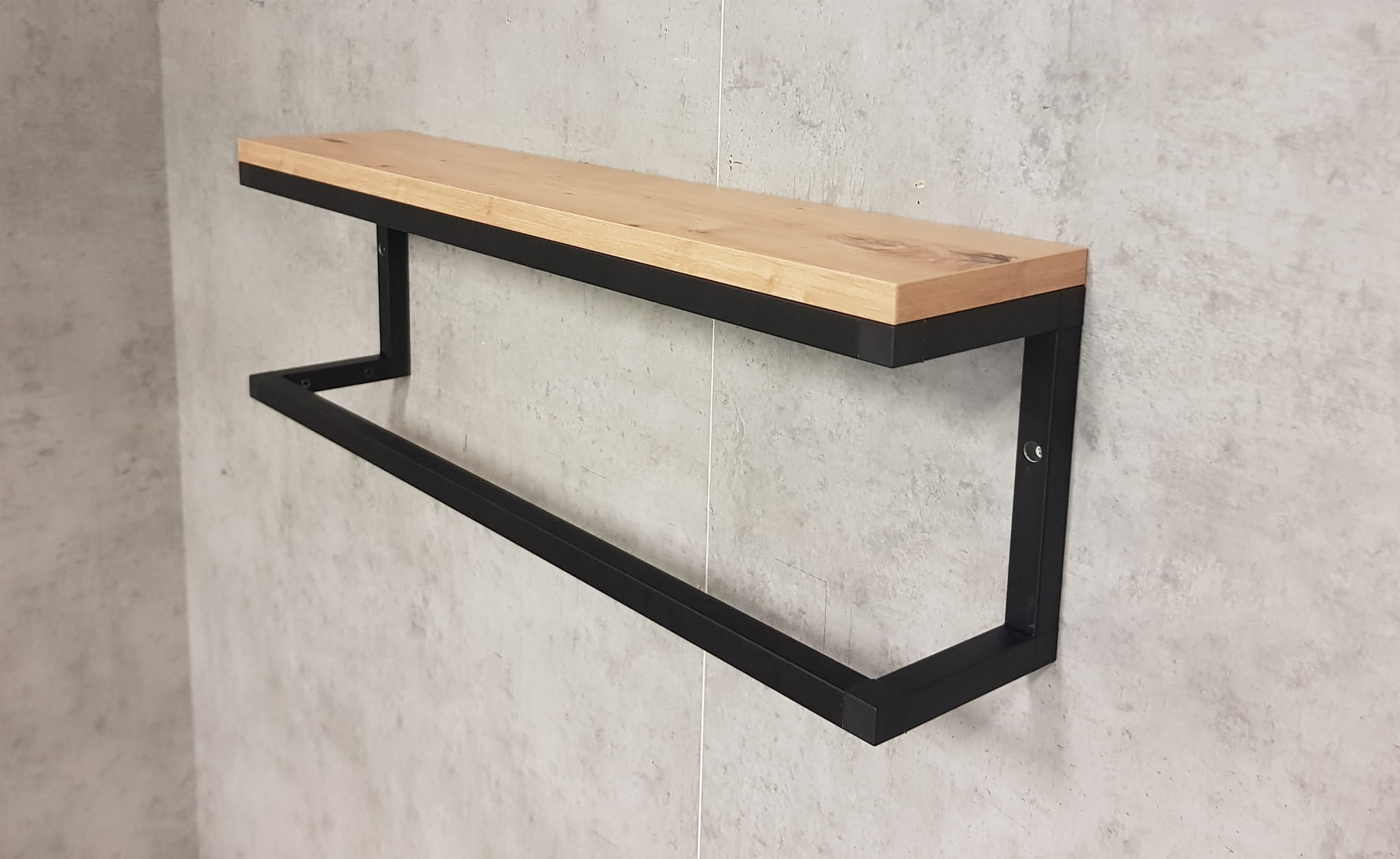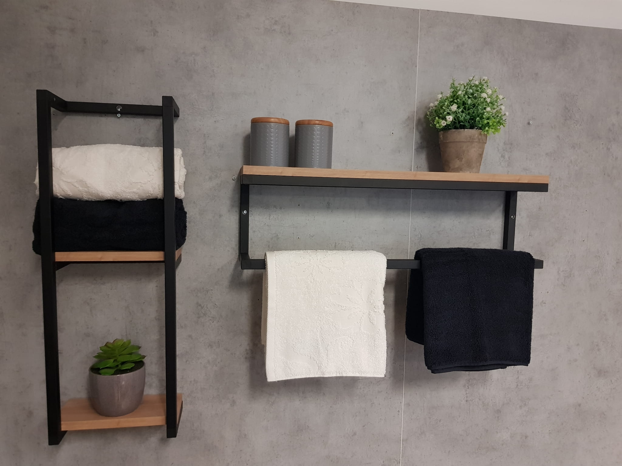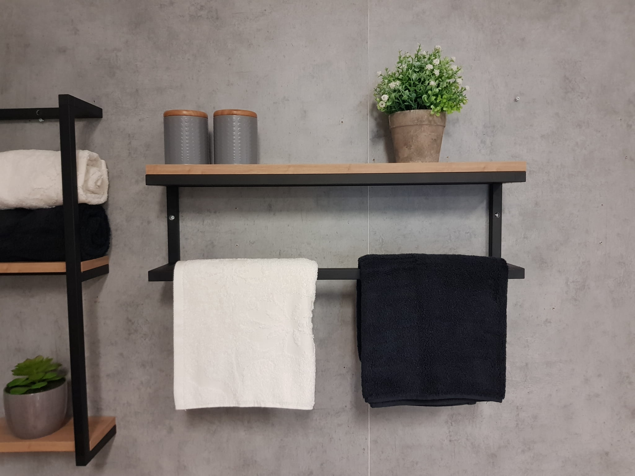 Wieszak loftowy do łazienki na ręczniki z praktyczną półką.